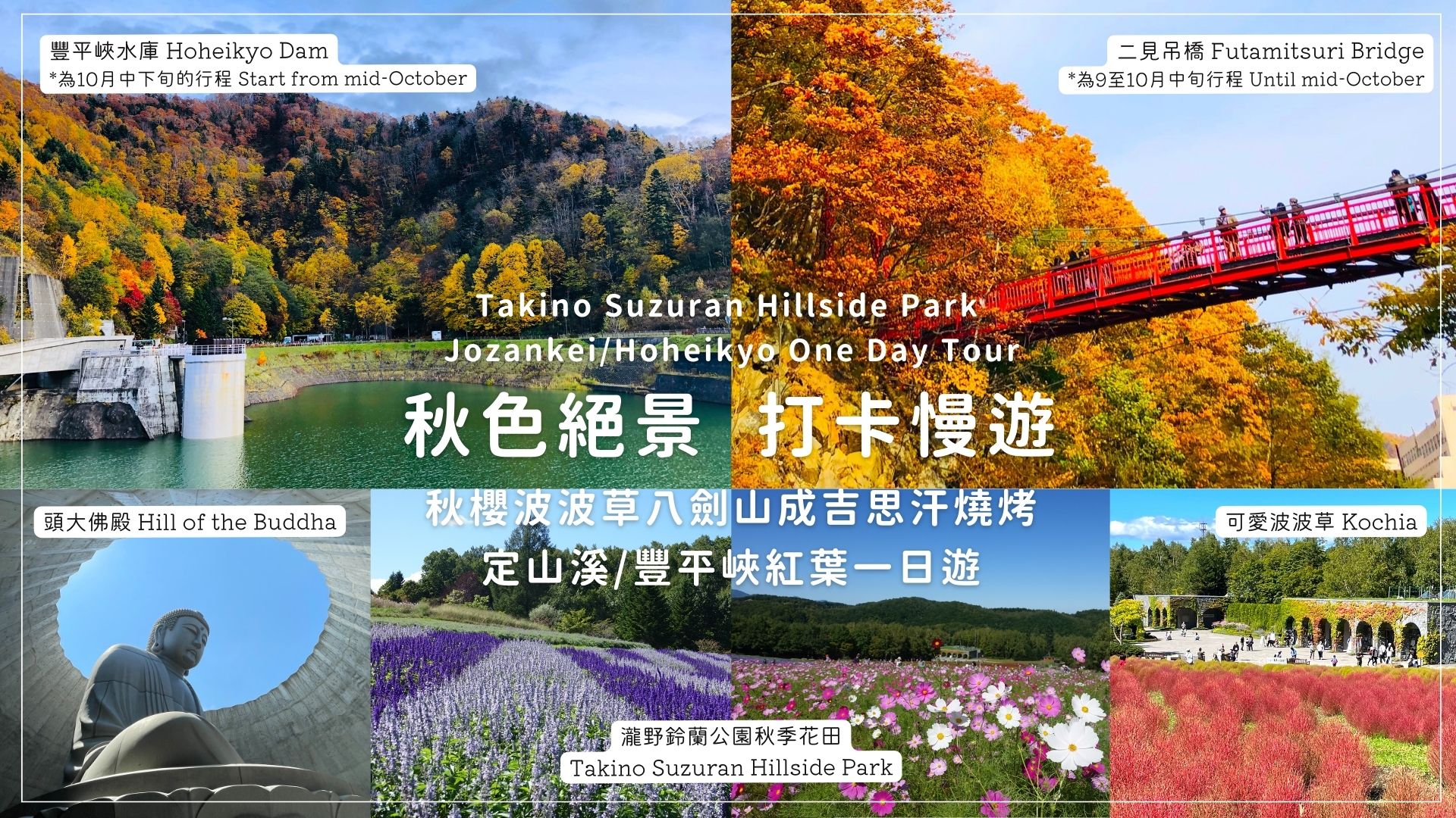 因應時期帶大家去看最美的秋色!會帶大家去看10月中起秋意濃的豐平峽水庫。乘坐電氣巴士,穿過隧道,走在過百米高的拱形水庫之上,欣賞交織在萬千秋色之中的千丈岩、金黃色峽谷下的定山湖,更有機會見到水庫放流的壯觀景象,難怪有被入選為日本的百大水源之森、百大水庫湖之一!